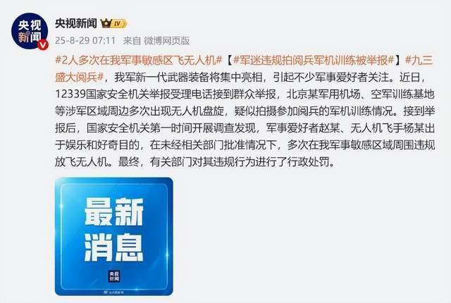 1、钱江晚报《2人多次在我军事敏感区飞无人机,系军迷违规拍阅兵军机训练被举报!国家安全部通报》